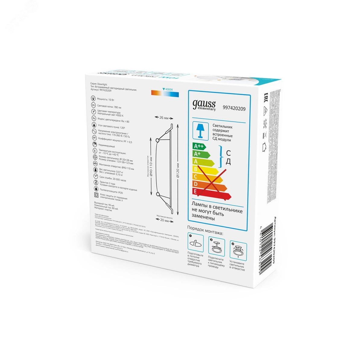 Светильник светодиодный ДВО 9 Вт 4000К 720 лм 170-260В IP20 D120х26мм монт d90мм Пластик Elementary Gauss