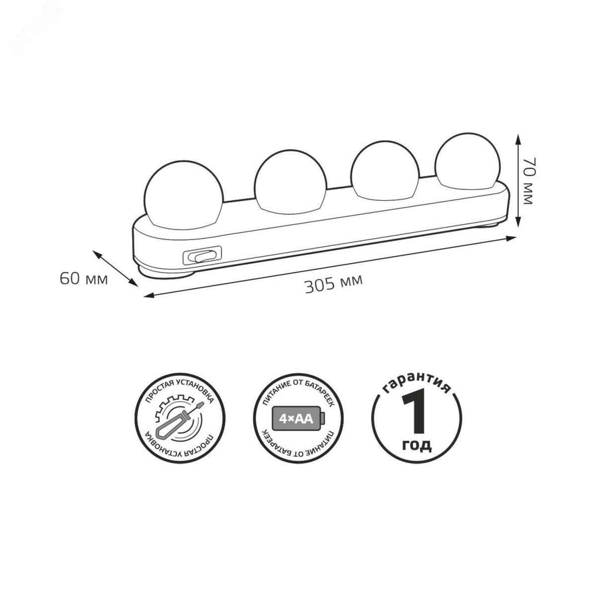 Простая установка|Отсутствие пульсации|Яркий свет|Питание от батареек|Гарантия 1 год