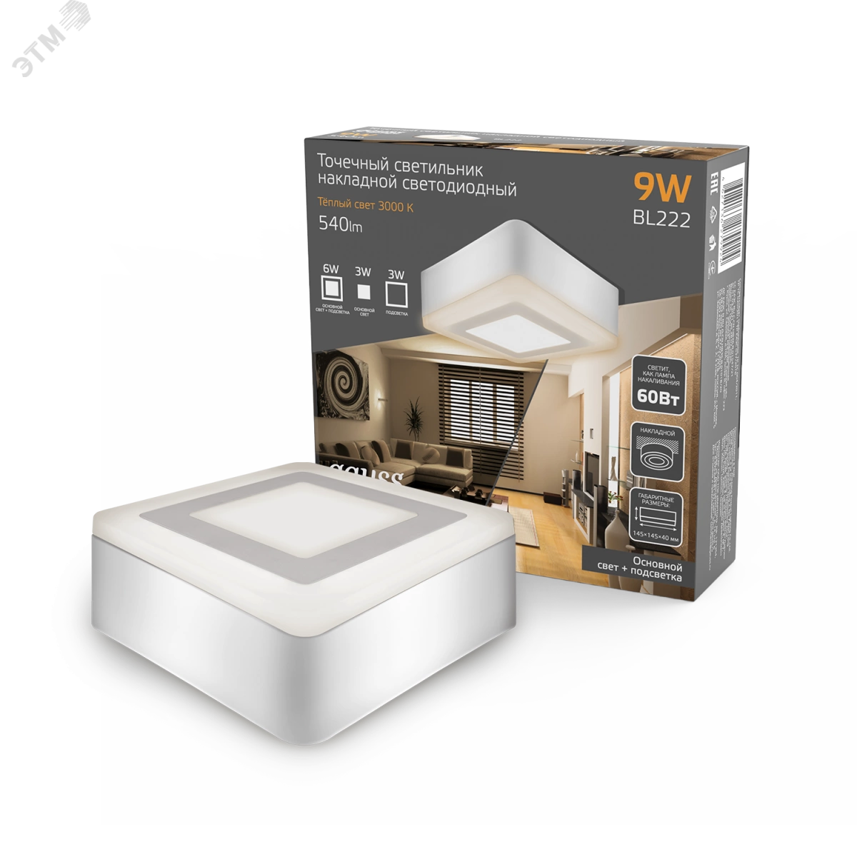 Светильник светодиодный накладной ДПО-6+3 Вт 540Лм 3000К квадрат белый IP20 3 режима LED 145х145 мм 220-240 В Backlight Gauss