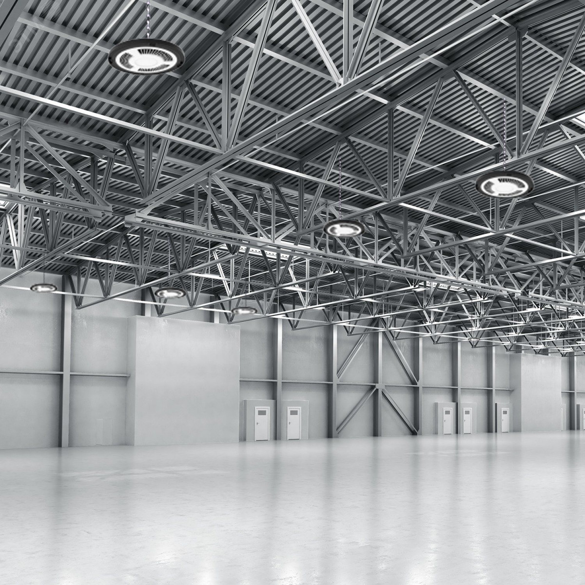 Светодиодные светильники серии UFO с нейтральным белым цветом свечения 5000K идеально подойдут для освещения помещений с высокими потолками, таких как: производственные цеха, склады, ангары и выставочные павильоны. Можно не беспокоиться об освещении помещений с высоким уровнем пыли и влаги, т.к. данные светильники имеют степень защиты IP65 и рабочий диапазон температуры окружающей среды от -30 до +45 градусов. Уникальное отличие данной модели – монтажная скоба, которая идет в комплекте со светильником. Благодаря этому у вас появляется возможность крепления светильника не только на трос, но и на стену или потолок. Отсутствие пульсации, высокая светоотдача 120Лм/Вт и удобство монтажа делают светильники серии UFO универсальным помощником для освещения промышленных объектов.
