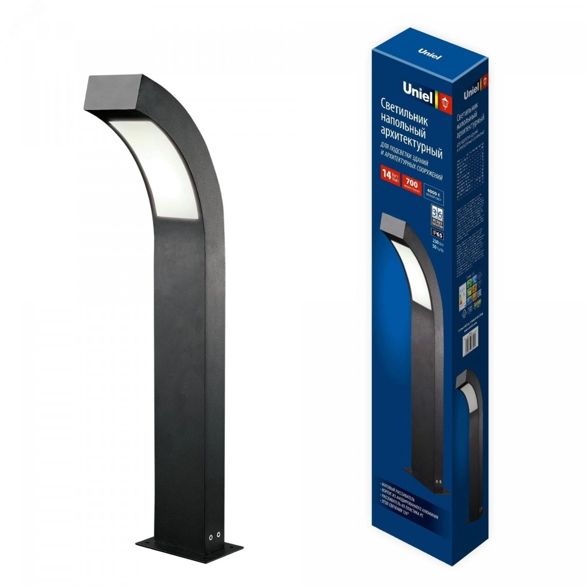 Светильник светодиодный уличный напольный ULU-T72A-14W/4000K IP65 BLACK предназначен для архитектурно-художественного освещения и ориентирующей подсветки парков, скверов, бульваров, прогулочных дорожек и частных территорий. Корпус светильника выполнен из анодированого алюминия. Матовый рассеиватель изготовлен из поликарбоната. Цвет корпуса - черный. Свет - белый. Угол светового потока - 120?. Прибор устойчив к вибрациям и колебаниям напряжения сети. Мощность светильника - 14 Вт, световой поток 900 лм, степень пылевлагозащиты - IP65. Цветовая температура - 4000 К. Диапазон рабочих температур - от -40 до +75 С?. Способ установки - напольный. В комплект поставки входят все необходимые крепежные элементы. Требуется подключение к электросети. Светильник не требует перерывов в работе, дополнительного обслуживания и замены ламп за весь срок эксплуатации. Гарантия от производителя - 3 года. Срок службы - 50 000 часов.