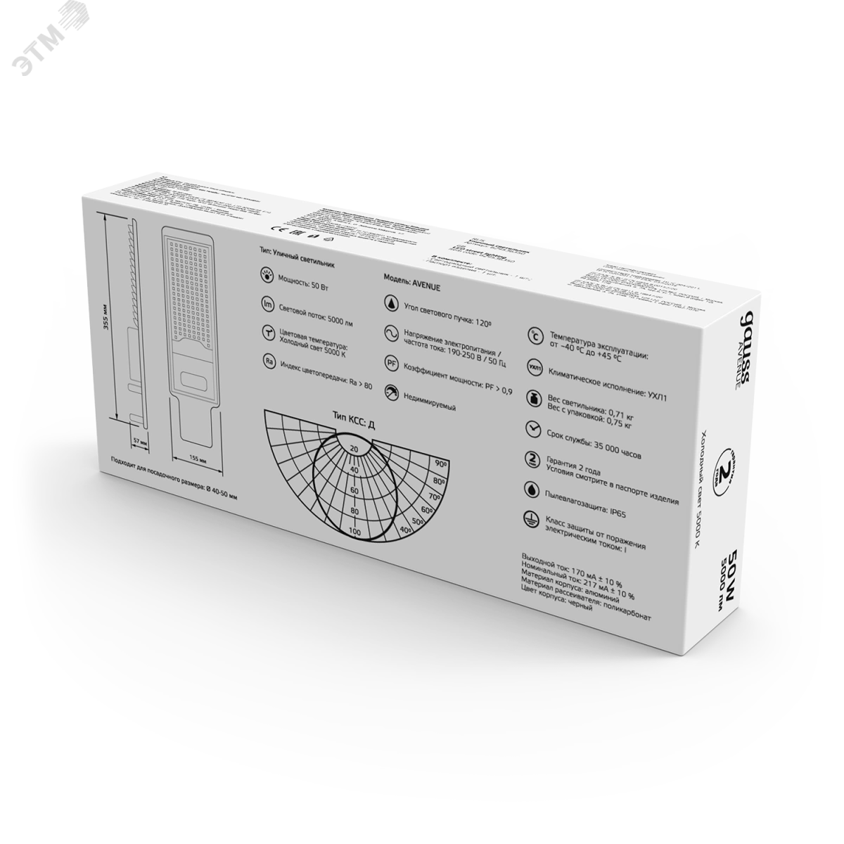 Светильник светодиодный уличный ДКУ-50 Вт 5000 Лм 5000K IP65 190-250 В КСС Д LED Avenue Gauss