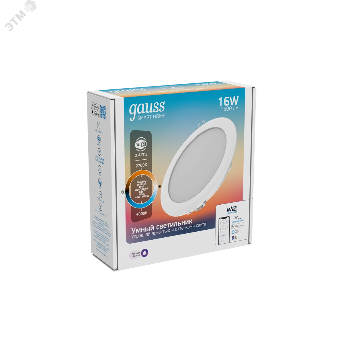 Светильник светодиодный умный встраиваемый ДВО 16 Вт 1600 Лм 2700-4000К круг IP20 изм.цвет.тем+дим LED 165х38 мм 220-240V управление по Wi-Fi Smart Home Gauss