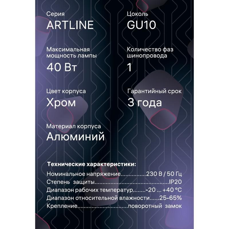 Полное описание: Светильник трековый ARTLINE поворотный 55х55х100мм GU10 230В алюм. 4кв.м хром. Ritter 59877 4