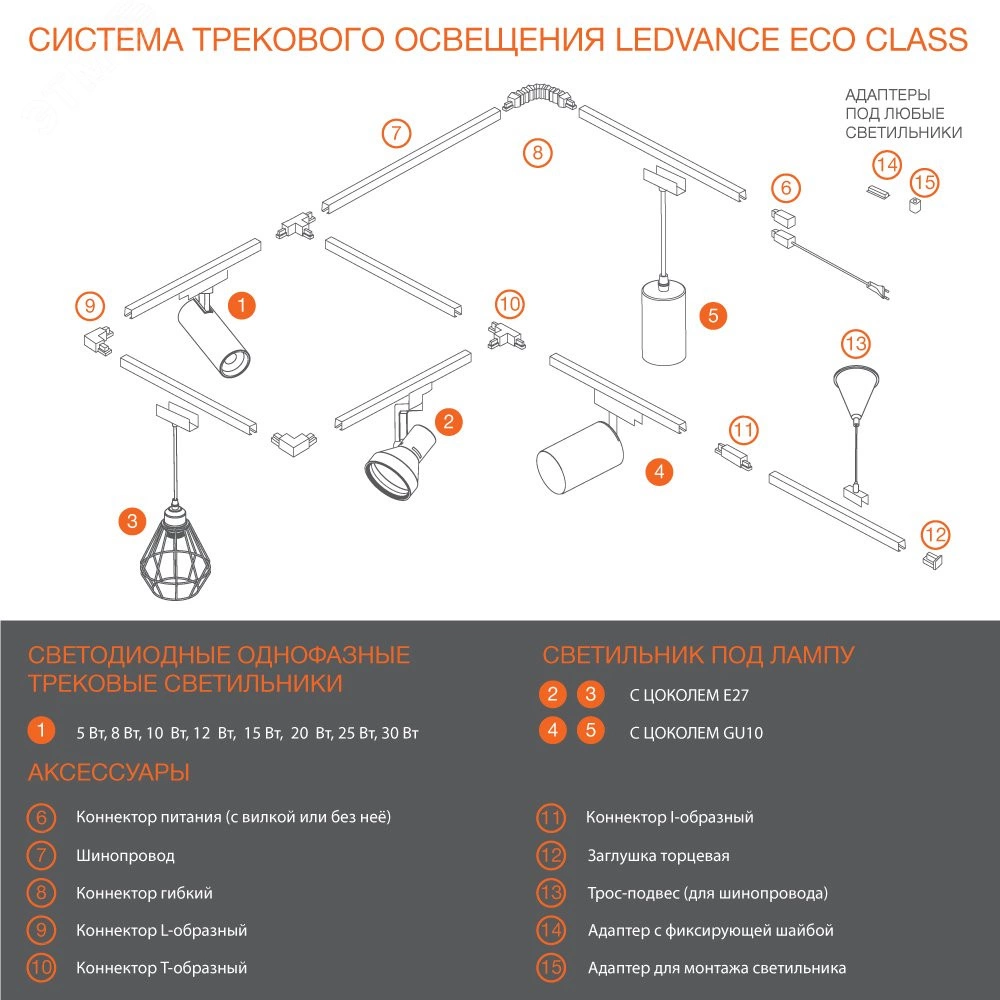 Однофазные трековые светодиодные светильники/прожекторы LEDVANCE ECO CLASS! В линейке сбалансированное количество различных мощностей от 5 до 30 Вт черного и белого цвета. Современный дизайн светильников впишется в любой интерьер спальни, кухни, лоджии, прихожей для создания стильного акцентного или общего освещения. Светильники совместимы с любыми однофазными шинопроводами, а также в линейке доступны все необходимые аксессуары для создания трековых систем освещения.