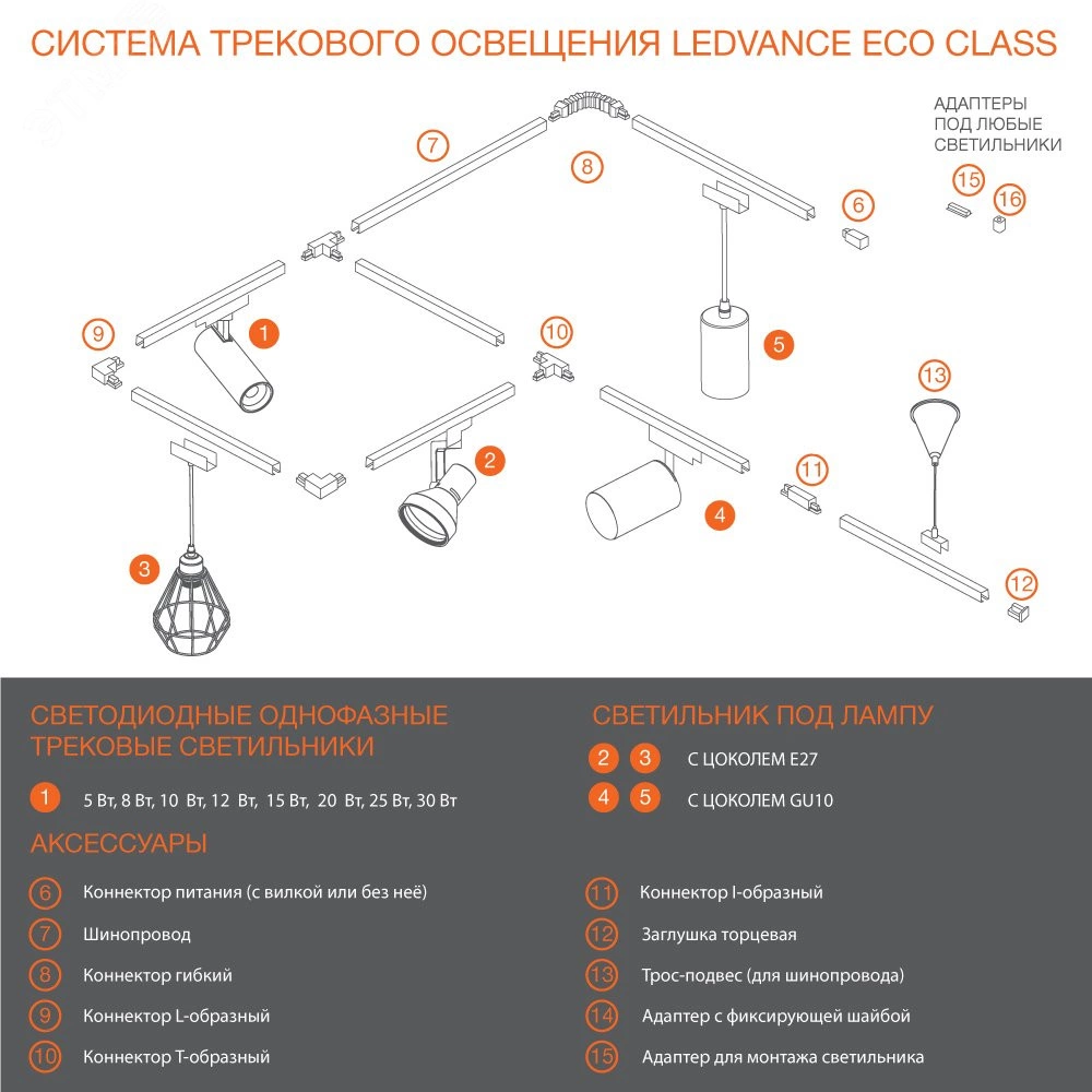 Однофазные трековые светодиодные светильники/прожекторы LEDVANCE ECO CLASS! В линейке сбалансированное количество различных мощностей от 5 до 30 Вт черного и белого цвета. Современный дизайн светильников впишется в любой интерьер спальни, кухни, лоджии, прихожей для создания стильного акцентного или общего освещения. Светильники совместимы с любыми однофазными шинопроводами, а также в линейке доступны все необходимые аксессуары для создания трековых систем освещения.