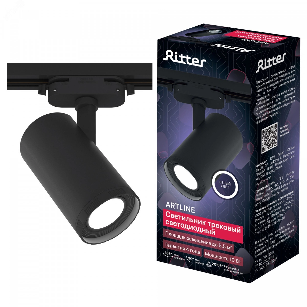 Светильник трековый, накладной, светодиодный, ARTLINE, поворотный, с регулировкой фокуса, цилиндр, 57x57x135mm, 10Вт, 850Лм, 4000К, 230В, алюминий, 5,5м, черный, 59740 1, Ritter