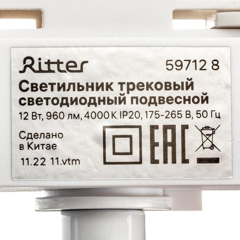 Светильник трековый подвес светодиодный ARTLINE 40х40х300мм 12Вт 960Лм 4000К 230В алюм. 6.4кв.м бел. Ritter 59712 8