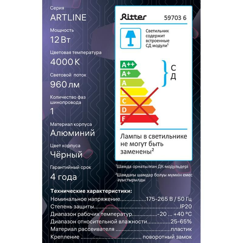 Полное описание: Светильник трековый подвес светодиодный ARTLINE 80х80х100мм 12Вт 960Лм 4000К 230В алюм. 4.2кв.м черн. Ritter 59703 6