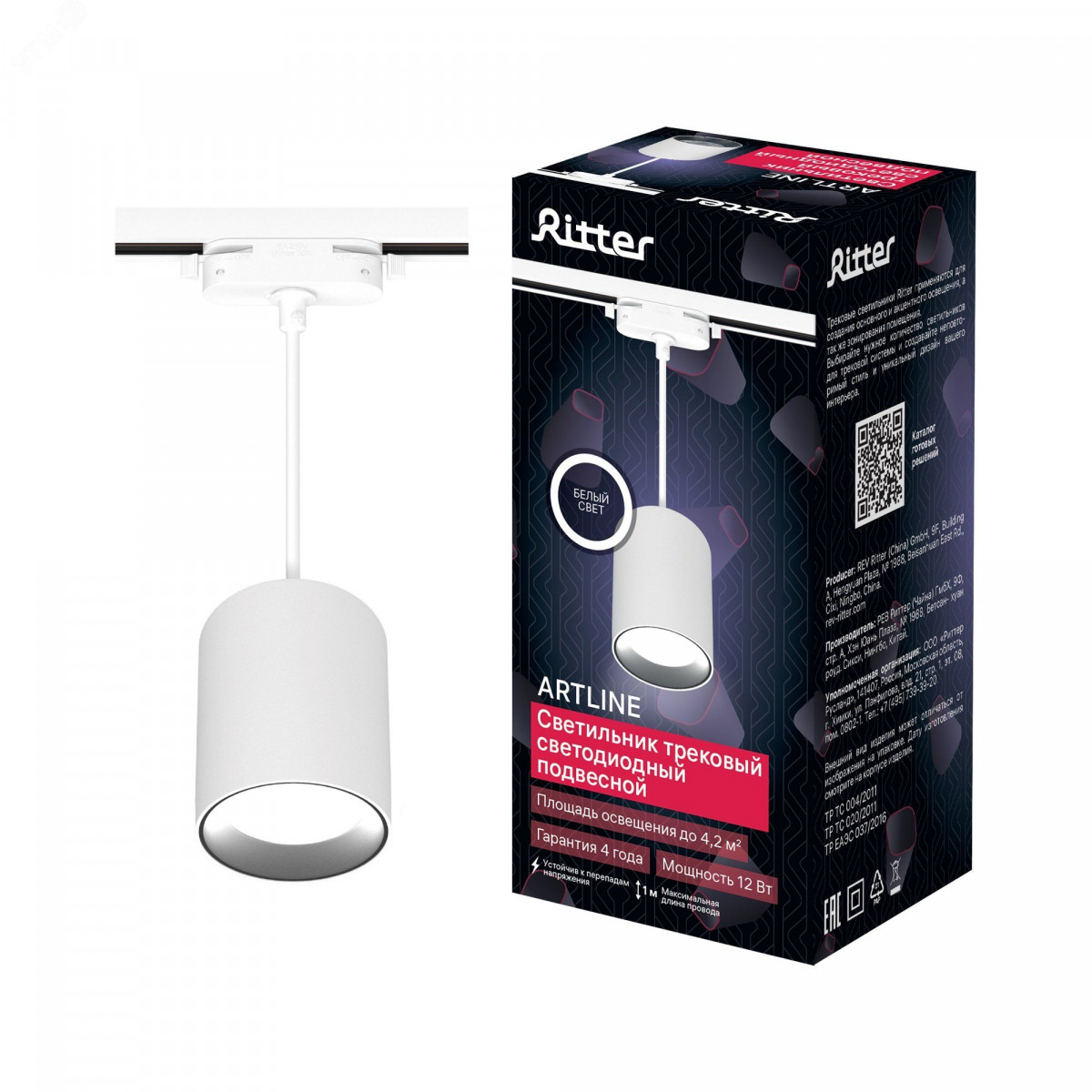 Светильник трековый, подвесной, светодиодный, ARTLINE, цилиндр, 80х80х100mm, 12Вт, 960Лм, 4000К, 230В, алюминий, 4,2м, белый, 59702 9, Ritter