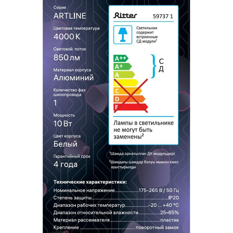 Полное описание: Светильник трековый светодиодный ARTLINE поворотный 57х57х135мм 10Вт 850Лм 4000К 230В алюм. 5.5кв.м бел. Ritter 59737 1