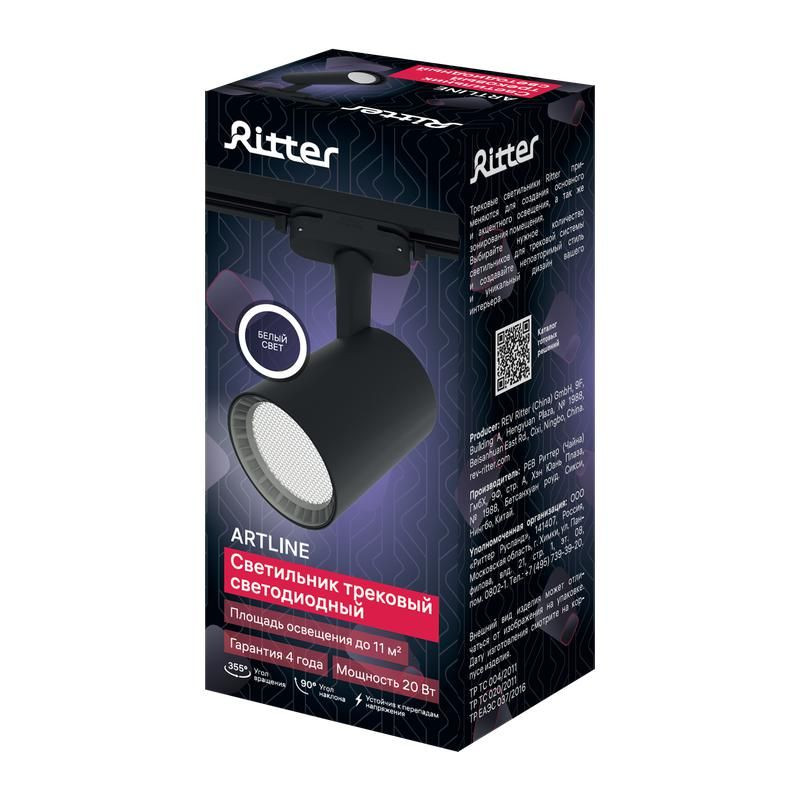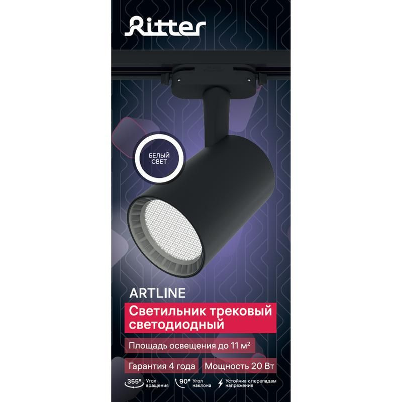 Светильник трековый светодиодный ARTLINE поворотный 75х75х115мм 20Вт 1700Лм 4000К 230В алюм. 9кв.м черн. Ritter 59735 7