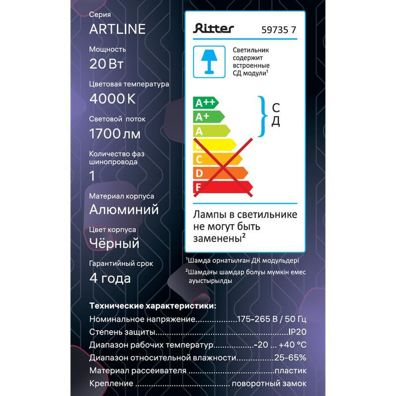 Полное описание: Светильник трековый светодиодный ARTLINE поворотный 75х75х115мм 20Вт 1700Лм 4000К 230В алюм. 9кв.м черн. Ritter 59735 7