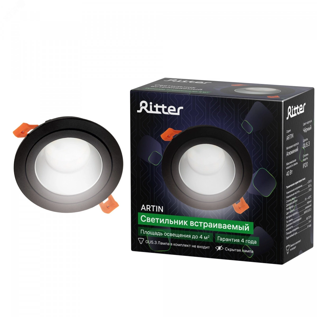 Светильник встраиваемый, ARTIN, скрытая лампа, круг, 92х92х40мм, монтажное отверстие 80х80мм, GU5.3, алюминий, черный, 51416 9, Ritter