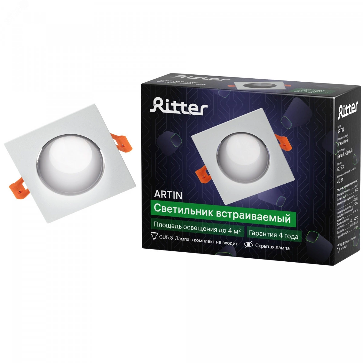 Встраиваемый потолочный светильник Artin Ritter - отличный вариант для создания акцентного освещения в нишах потолка или стен. Подходит как для жилых и производственных помещений, так и для офисов, магазинов в качестве акцентной подсветки кухонных гарнитуров, небольших витрин, шкафов, и вспомогательного интерьерного освещения. А также располагать вместо накладных потолочных светильников. В светильнике предусмотрен патрон под одну скрытую лампочку с цоколем GU5.3, максимальной мощностью 40 Вт. Лампочка приобретается отдельно. Используйте квадратный светильник вместе с люстрой или как самостоятельный источник света. Цоколь – GU5.3. Размер – 90х90х30 мм. Монтажное отверстие – 75х75 мм. Материал корпуса – алюминий. Цвет – белый, черный. Номинальное напряжение – 230 В. Степень защиты – IP20.