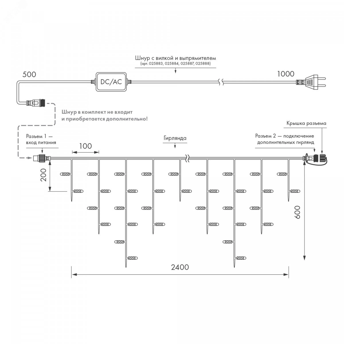 Светодиодная гирлянда ''БАХРОМА'' предназначена для создания светового праздничного декора. Может применяться как самостоятельное украшение и как световой элемент иллюминации внутри и снаружи помещений (при соблюдении условий монтажа и эксплуатации). Благодаря наличию универсальных соединительных разъемов имеется возможность нарастить длину иллюминации до 50 метров без дополнительных аксессуаров. Подобная функциональность позволяет реализовать проект декоративного освещения практически любого масштаба. Для подключения одной гирлянды или нескольких гирлянд к сети АС 230 В необходимо приобрести шнур питания с выпрямителем AC/DC.