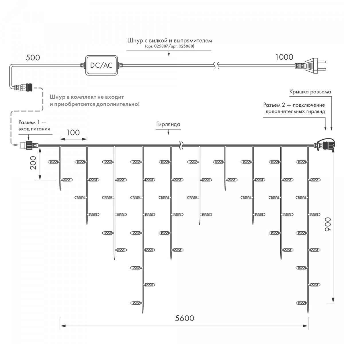Светодиодная гирлянда ''БАХРОМА'' предназначена для создания светового праздничного декора. Может применяться как самостоятельное украшение и как световой элемент иллюминации. Имеет разъем для соединения нескольких гирлянд в единую линию. Подключается к сети питания AC 230 В с помощью питающего кабеля с выпрямителем напряжения и сетевой вилкой, приобретаемого отдельно.