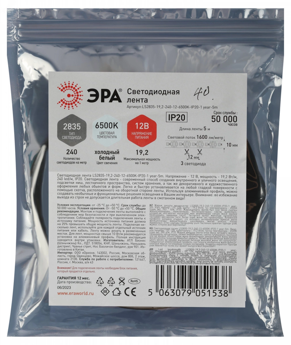 Светодиодная лента LS2835-19,2-240-12-6500K-IP20-1 year-5m со степенью защиты от пыли и влаги IP20 легко и быстро устанавливается на любой гладкой поверхности с помощью скотча, расположенного на оборотной стороне ленты. Используя алюминиевый профиль, можно создавать необычные и функциональные решения освещения в Вашем интерьере. Рабочее напряжение ленты составляет 12 В, а мощность равна 19,2 Вт/м. Светодиодная лента обладает световым потоком 1600 лм/м с холодным белым цветом свечения (6500К).ВНИМАНИЕ:- светодиодную ленту с напряжением 12В допустимо подключать последовательно отрезками не более 5 м.- для светодиодных лент с мощностью выше 9.6 Вт обязательно использование алюминиевого профиля для дополнительного охлаждения. Это существенно продлит срок службы светодиодной ленты.- во избежание выхода из строя не допускается длительная работа ленты в смотанном виде.