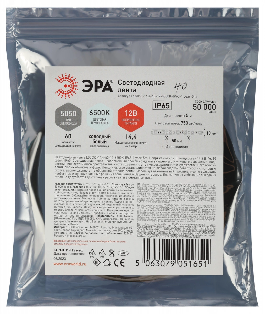 Светодиодная лента LS5050-14,4-60-12-6500K-IP65-1 year-5m со степенью защиты от пыли и влаги IP65 легко и быстро устанавливается на любой гладкой поверхности с помощью скотча, расположенного на оборотной стороне ленты. Используя алюминиевый профиль, можно создавать необычные и функциональные решения освещения в Вашем интерьере. Рабочее напряжение ленты составляет 12 В, а мощность равна 14,4 Вт/м. Светодиодная лента обладает световым потоком 750 лм/м с холодным белым цветом свечения (6500К).ВНИМАНИЕ:- светодиодную ленту с напряжением 12В допустимо подключать последовательно отрезками не более 5 м.- для светодиодных лент с мощностью выше 9.6 Вт обязательно использование алюминиевого профиля для дополнительного охлаждения. Это существенно продлит срок службы светодиодной ленты.- во избежание выхода из строя не допускается длительная работа ленты в смотанном виде.