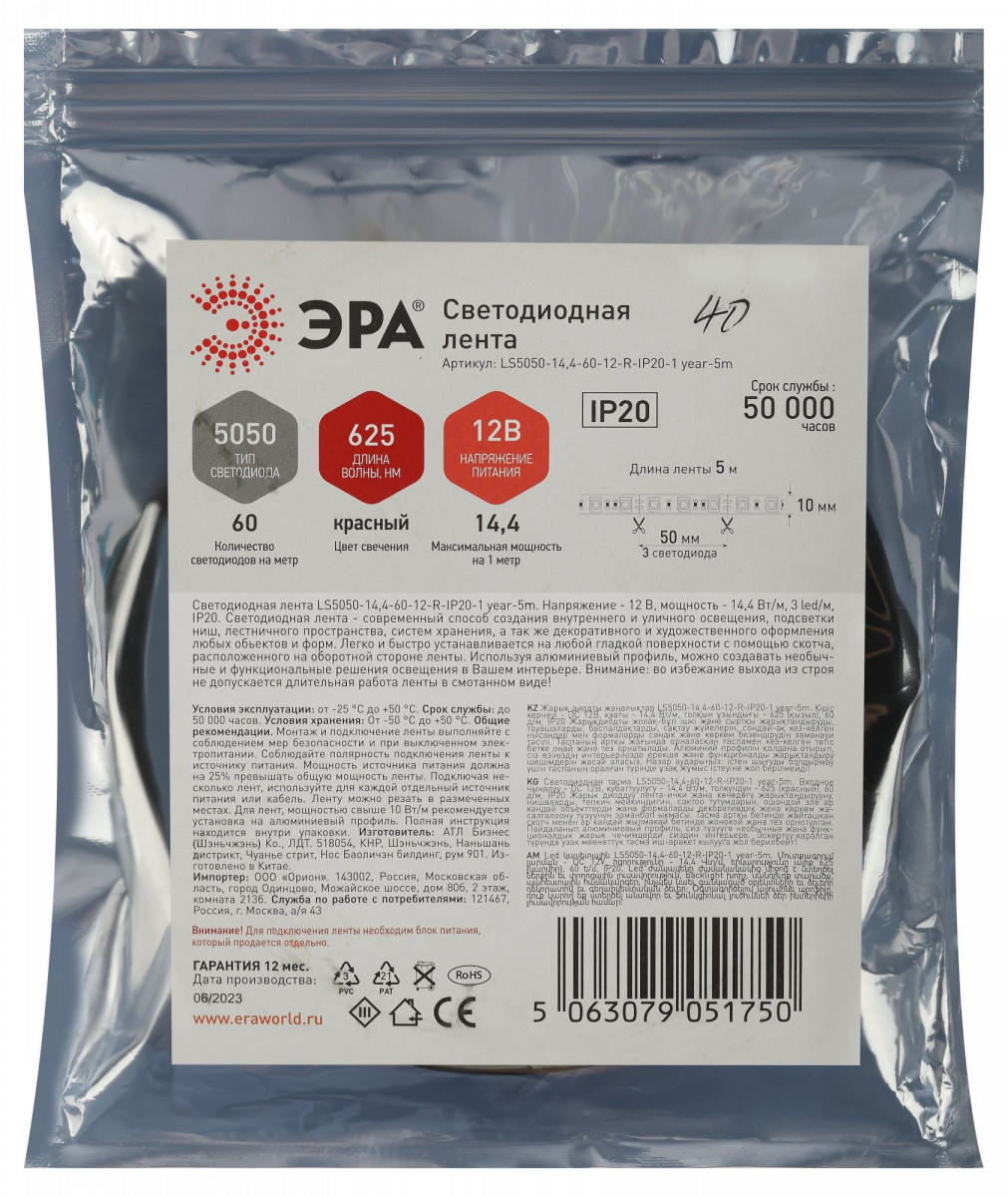 Светодиодная лента LS5050-14,4-60-12-R-IP20-1 year-5m со степенью защиты от пыли и влаги IP20 легко и быстро устанавливается на любой гладкой поверхности с помощью скотча, расположенного на оборотной стороне ленты. Используя алюминиевый профиль, можно создавать необычные и функциональные решения освещения в Вашем интерьере. Рабочее напряжение ленты составляет 12 В, а мощность равна 14,4 Вт/м. Светодиодная лента обладает - красным цветом свечения (625нМ).ВНИМАНИЕ:- светодиодную ленту с напряжением 12В допустимо подключать последовательно отрезками не более 5 м.- для светодиодных лент с мощностью выше 9.6 Вт обязательно использование алюминиевого профиля для дополнительного охлаждения. Это существенно продлит срок службы светодиодной ленты.- во избежание выхода из строя не допускается длительная работа ленты в смотанном виде.