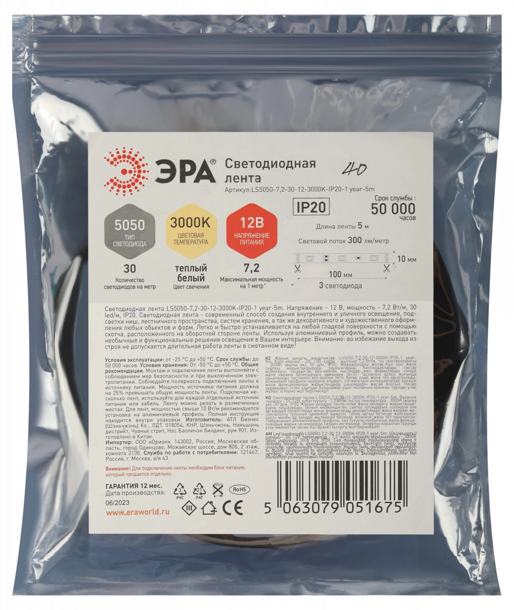 Светодиодная лента LS5050-7,2-30-12-3000K-IP20-1 year-5m со степенью защиты от пыли и влаги IP20 легко и быстро устанавливается на любой гладкой поверхности с помощью скотча, расположенного на оборотной стороне ленты. Используя алюминиевый профиль, можно создавать необычные и функциональные решения освещения в Вашем интерьере. Рабочее напряжение ленты составляет 12 В, а мощность равна 7,2 Вт/м. Светодиодная лента обладает световым потоком 300 лм/м с теплым белым цветом свечения (3000К).ВНИМАНИЕ:- светодиодную ленту с напряжением 12В допустимо подключать последовательно отрезками не более 5 м.- для светодиодных лент с мощностью выше 9.6 Вт обязательно использование алюминиевого профиля для дополнительного охлаждения. Это существенно продлит срок службы светодиодной ленты.- во избежание выхода из строя не допускается длительная работа ленты в смотанном виде.