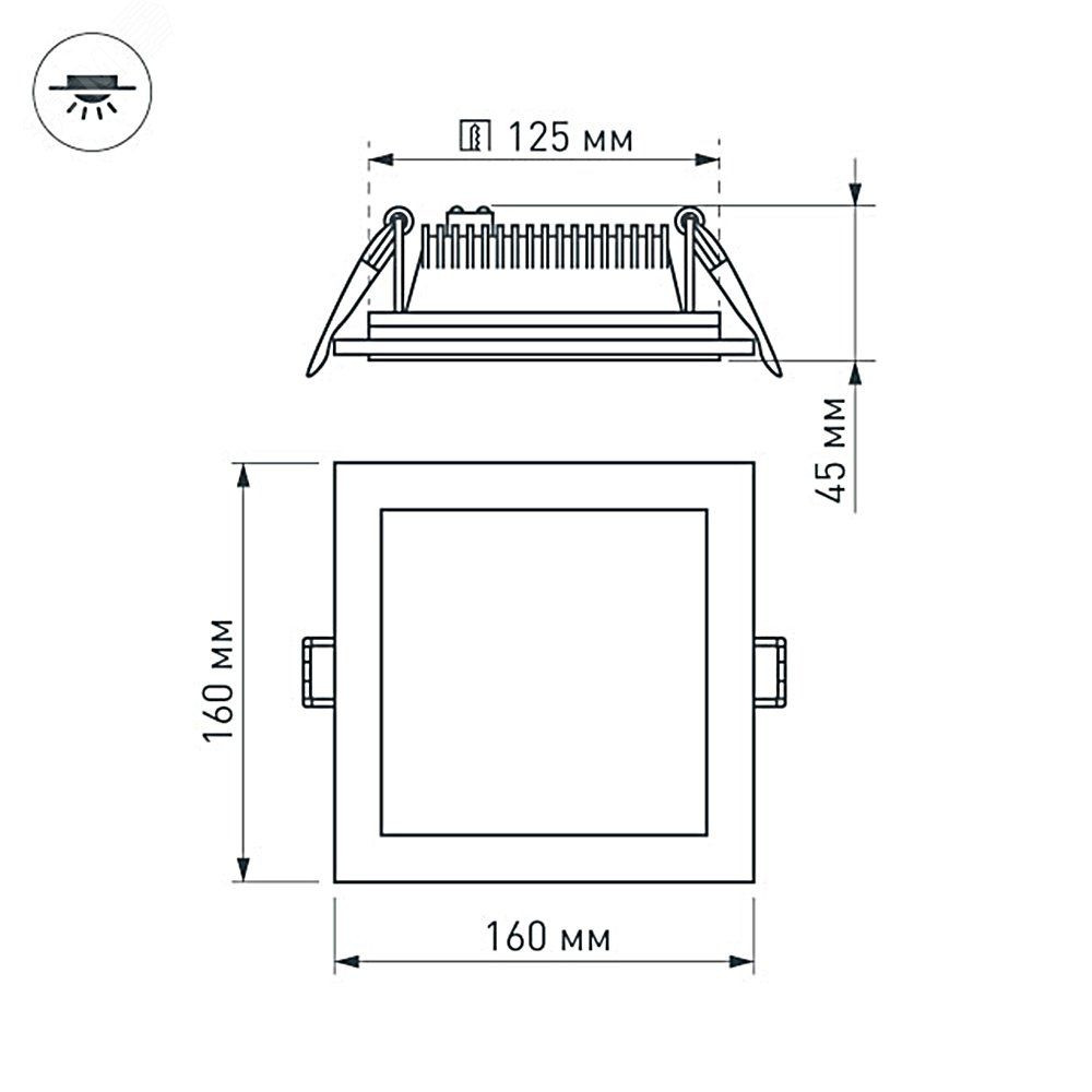 Стеклянная квадратная панель 12Вт / ТЕПЛЫЙ 2700-3000K / 950лм / 120 градусов . Размер 160x160x45мм (в отверстие 125x125мм). Корпус белый. Питание от сети 230VAC, драйвер в к-те 300mA 25-45V. Для использования с диммерами TRIAC замените драйвер на ARJ-LK48320-DIM (приобретается отдельно). Для помещений.