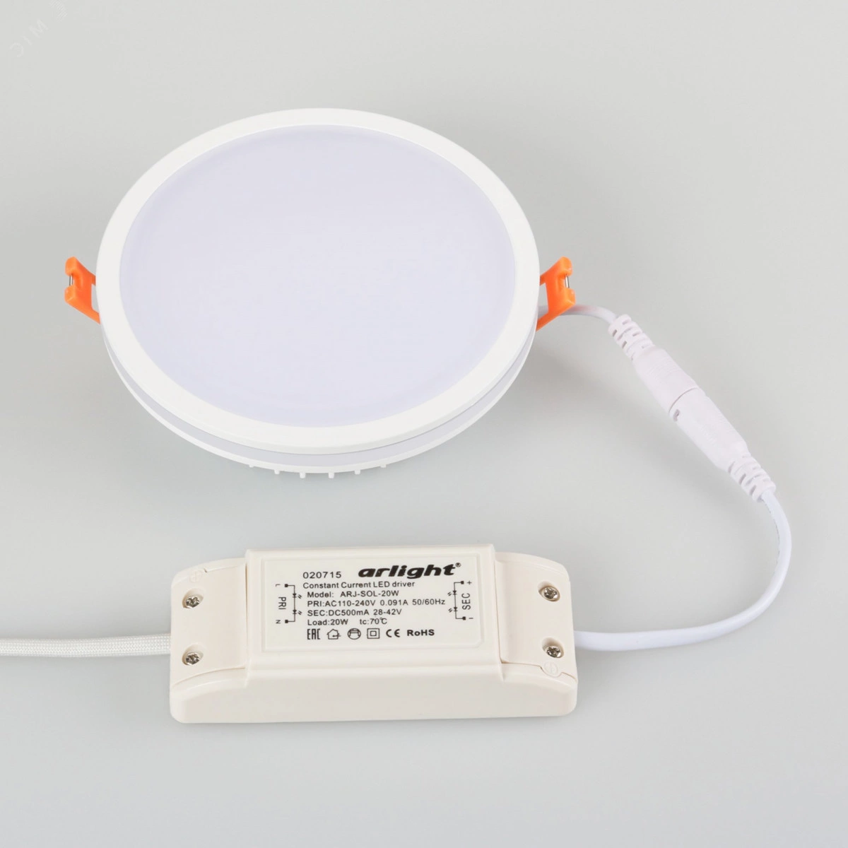 Круглый светильник с контурным свечением. Корпус IP44 белый плюс вставка поликарбонат PC. Цвет ТЕПЛЫЙ БЕЛЫЙ 3000К, св.поток 1400-1600 лм, угол 120 градусов плюс180 градусов . Питание 180-240VAC, 20Вт. Драйвер в комплекте 500mA 28-42V. Размеры 135х40 мм, установка в отв.125 мм, высота мин.40 мм.