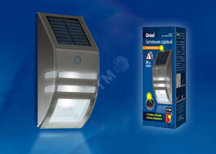 Настенный садовый светильник на солнечной батарее USL-F-164/MT170 SENSOR с датчиком движения предназначен для уличного освещения и декоративной подсветки фасадов. Крепится на вертикальную поверхность. Светильник работает в двух режимах - дежурное и рабочее освещение. В светильнике используется светодиод (SMD, 2 шт) дневного света (6500К). Срок службы - до 30000 часов. Светильник предназначен для уличной подсветки, поэтому рассчитан на работу при высоких и низких температурах. Корпус светильника изготовлен из нержавеющей стали, цвет - серебряный, степень защиты от влаги IP44. Подключение к электросети не требуется. Встроенный аккумулятор 600 мАч, заряжается в светлое время суток с помощью солнечной панели. Полностью заряженный аккумулятор обеспечивает освещение до 8 часов. В комплект входит набор для монтажа. Размер изделия 165x75x50 мм. Вес изделия 195 г. Гарантия 12 месяцев.