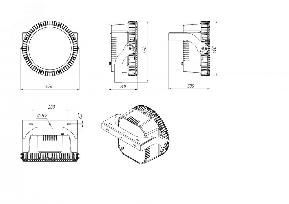 Корпус, радиатор и прижимкая рамка из литого под давлением алюминия. Источники питания установлены внутри корпуса. Поворотный кронштейн из окрашенной стали 3 мм имеет особую изогнутую конструкцию, позволяющую избежать потерь светового потока на элементах осветительных мачт.