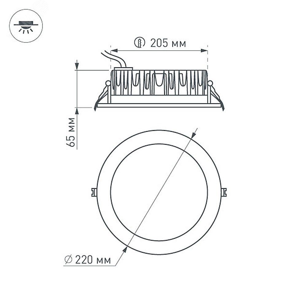 Встраиваемый круглый светильник, угол 110 градусов / 30Вт / БЕЛЫЙ 6000K / светодиод 1x30W / 2400-2700 лм, CRI-80. Белая лицевая панель. IP44. Питание AC180-240V, 30Вт, 700mA 39-47V, драйвер в комплекте. Размеры DxH - 220х65мм, отверстие для установки 205мм.
