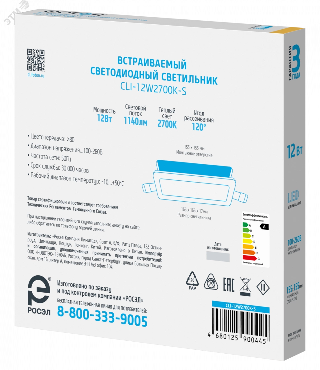 Светодиодный светильник встраиваемый квадратный CLI-12W2700K-S