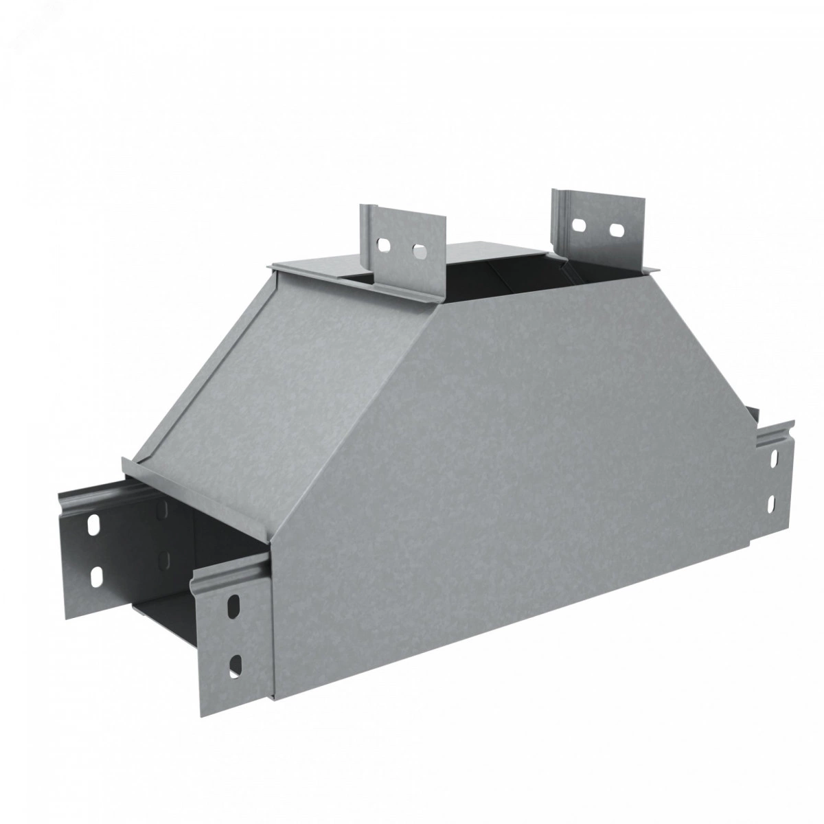 Для обеспечения заданных радиусов изгиба кабельной трассы при монтаже используется Т-отвод вертикальный вверх серии ''PLUS''. Конструкция элемента применима для отвода трассы вверх, при этом разворачивая открытую часть металлического лотка вокруг своей оси на 90 градусов. Элемент рекомендовано использовать c металлическим листовым лотком этой же серии шириной 500 мм и высотой борта 100 мм. Изделие выполнено из стали и оцинковано по методу Сендзимира. Предназначено для применения в местах предпочтительно с сухим климатом, внутри помещений и в слабоагрессивных средах, в соответствии с ГОСТ15150-69. Специальные соединительные лепестки на корпусе секции обеспечивают необходимую жёсткость конструкции стыкового узла и целостность трассы.