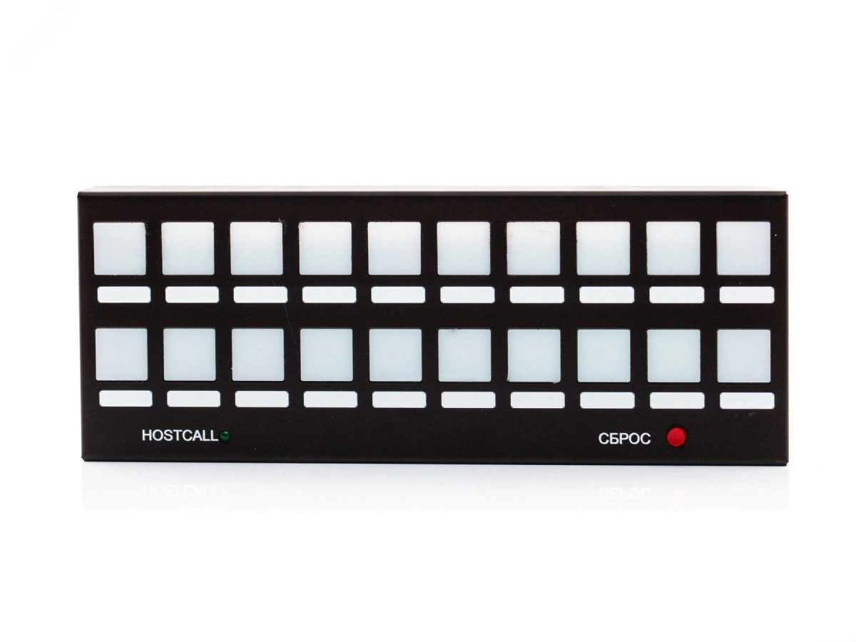 Табло отображения аварий MP-730W1 обеспечивает прием сигналов аварии по 20-ти шлейфным входам (от 20 точек контроля), световую и акустическую индикацию принятых сигналов аварии, сброс сигналов аварии. В системе могут использоваться до 16 табло отображения MP-730W1. В табло отображения MP-730W1 предусмотрена регулировка громкости звукового сигнала вызова. На передней панели корпуса табло отображения находятся 20 сегментов со светодиодным индикатором и полем белого цвета для надписи, соответствующие 20 точкам вызова. В нижней правой части табло отображения MP-730W1 расположена кнопка СБРОС, в левой - индикатор включения питания. Конструкция табло отображения MP-730W1 рассчитана на накладное крепление. Для питания табло отображения MP-730W1 используется блок питания 12В. Расстояние от табло отображения до блока питания не должно превышать 5 м.