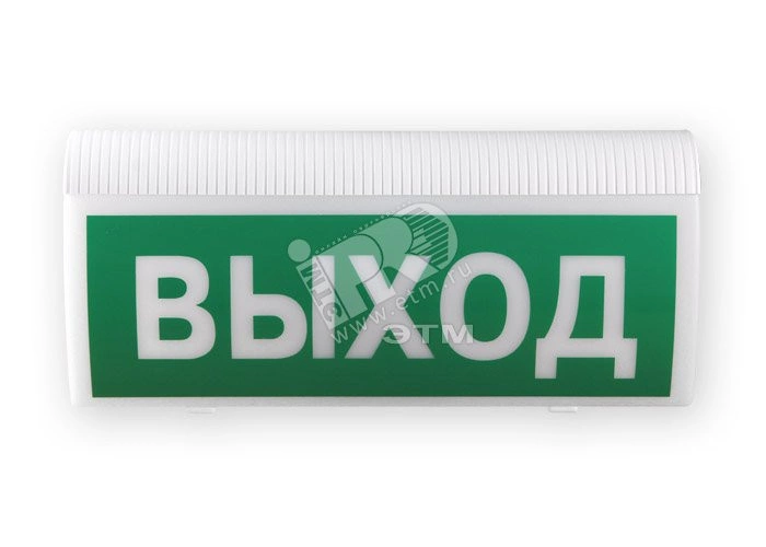 Световой указатель ''ВЫХОД'', радиоканальный 2,4 ГГц, питание от двух элементов – основного и резервного, контроль отрыва от стены, тестирование, регистрация и оптимизация радиосвязи с лазерного пульта Астра-942, дальность радиоканала до 300 м, IP30.