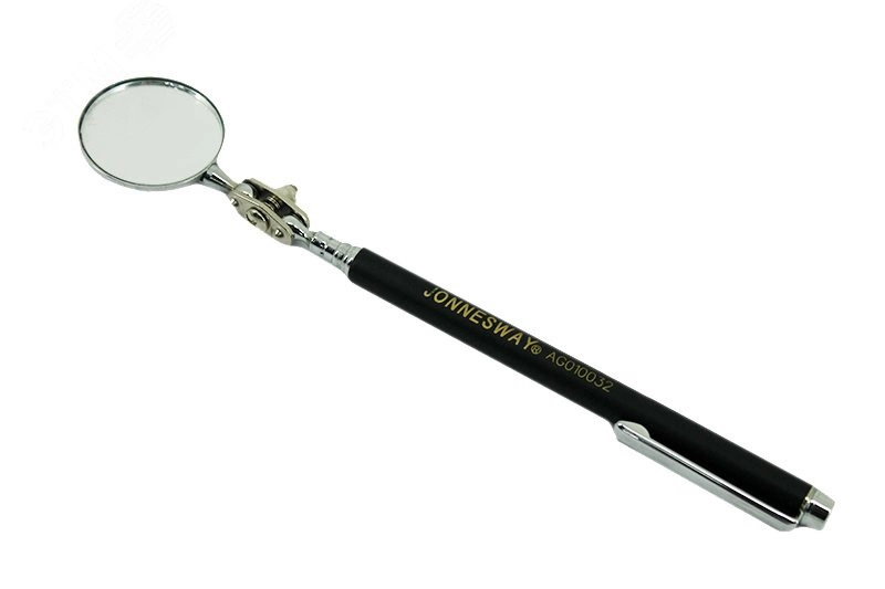 Круглое зеркало в металлической оправе, диаметром 58 мм, установленное на шарнире, закрепленном на телескопической стреле. Применяется для визуальной диагностики узлов и агрегатов в труднодоступных местах. Для удобства хранения инструмента в кармане, рукоятка снабжена зажимом. Диапазон длины 280-420 мм