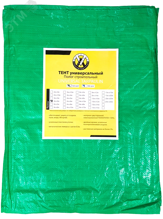 Строительные тенты изготовлены из полипропилена, имею прямоугольную форму, усиленные края и пластиковые уголки. Также вдоль каждого края расположены металлические люверсы с шагом 1м, позволяющие натянуть и закрепить тент в нужном положении. Чем выше плотность, тем с большей силой нужно воздействовать на разрыв и растяжение, что нанести повреждения тенту.