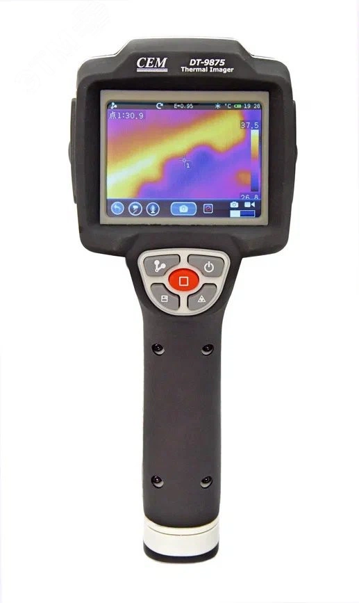 Тепловизор DT-9875 компании CEM разработан так, чтобы повседневная работа по энергоаудиту выполнялась быстрее, удобнее и более эффективно. К особенностям тепловизора DT-9875 относится большой дисплей, чувствительный к касанию, поэтому работа с измерительными маркерами и областями стала максимально удобной. Просто устанавливаете/перемещаете маркер одним касанием к дисплею. Корпус тепловизора выполнен из ударопрочного пластика. Тепловизор, представляя собой компактную фотокамеру, может потребоваться при проведении технического обслуживания, поиске и устранении неисправностей и др. проверках. Инфракрасные и стандартные снимки можно просмотреть на ЖК-мониторе, они хранятся на съемной карте памяти MicroSD. Для переноса снимков на персональный компьютер необходимо извлечь SD карту из прибора и установить ее в считывающее устройство, подключенное к компьютеру.