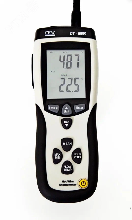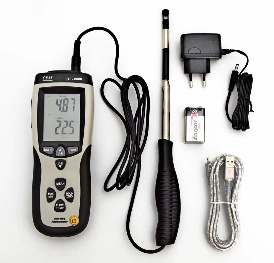 Термоанемометр для измерения очень низких скоростей воздушного потока. Тонкий зонд, идеально подходит для узких вентиляционных каналов. Сочетание нагретой струны и термосенсора, позволяют проводить быстрые и точные замеры. Удержание мин/макс/средних значений. Двойной жидкокристаллический дисплей одновременно отображает скорость и температуру воздуха. Сохранение показаний прибора на ПК. Индикация разряда батареи и автовыключение.