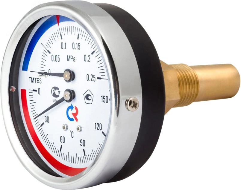 Термоманометр радиальный - комбинированный прибор, предназначенный для измерения температуры и избыточного давления неагрессивных к медным сплавам сред в системах теплоснабжения и водоснабжения. Термоманометр объединяет в одном корпусе манометр и термометр, имеет циферблат с двумя шкалами и две указательных стрелки. Одна шкала служит для отсчета давления, другая - температуры. Компания РОСМА выпускает устройства двух типоразмеров - диаметром корпуса 80 и 100 мм. По расположению штуцера приборы подразделяются на осевые и радиальные. Длина погружной части также может варьироваться по заказу потребителя.