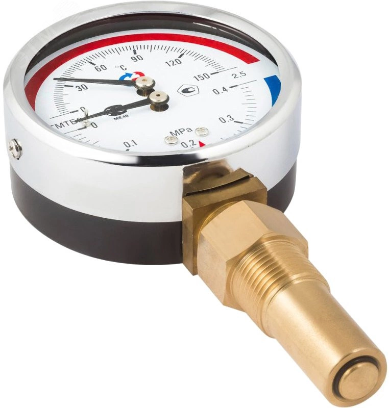 Термоманометр радиальный - комбинированный прибор, предназначенный для измерения температуры и избыточного давления неагрессивных к медным сплавам сред в системах теплоснабжения и водоснабжения. Термоманометр объединяет в одном корпусе манометр и термометр, имеет циферблат с двумя шкалами и две указательных стрелки. Одна шкала служит для отсчета давления, другая - температуры. Компания РОСМА выпускает устройства двух типоразмеров - диаметром корпуса 80 и 100 мм. По расположению штуцера приборы подразделяются на осевые и радиальные. Длина погружной части также может варьироваться по заказу потребителя.