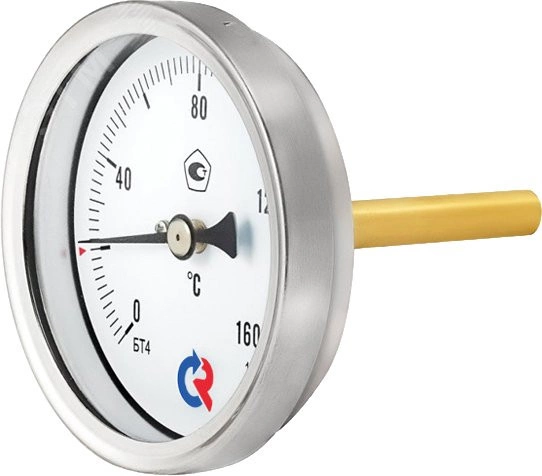 Прибор предназначен для измерения температуры жидкостей, пара и газов в отопительных и санитарных установках, в системах кондиционирования и вентиляции. Принцип действия прибора основан на зависимости деформации чувствительного элемента от измеряемой температуры. В качестве чувствительного элемента используется биметаллическая пружина. Она изготавливается из двух прочно соединенных металлических пластин, имеющих различные температурные коэффициенты линейного расширения. При изменении температуры пружина изгибается и вращает стрелку термометра. Один её конец закреплен внутри штока, а к другому присоединяется ось стрелки. Корпус прибора изготавливается из коррозионностойкой стали, шток - из нержавеющей стали.
