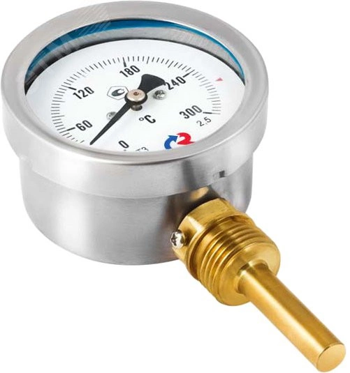 Прибор предназначен для измерения температуры жидкостей, пара и газов в отопительных и санитарных установках, в системах кондиционирования и вентиляции. Принцип действия прибора основан на зависимости деформации чувствительного элемента от измеряемой температуры. В качестве чувствительного элемента используется биметаллическая пружина. Она изготавливается из двух прочно соединенных металлических пластин, имеющих различные температурные коэффициенты линейного расширения. При изменении температуры пружина изгибается и вращает стрелку термометра. Один её конец закреплен внутри штока, а к другому присоединяется ось стрелки. Корпус прибора изготавливается из коррозионностойкой стали, шток - из нержавеющей стали.