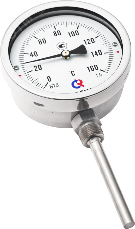 Предназначен для измерения температуры агрессивных жидкостей и газов. Принцип действия термометров БТ основан на зависимости деформации чувствительного элемента от измеряемой температуры. В качестве такого элемента используется биметаллическая пружина. Она изготавливается из двух прочно соединенных металлических пластин, имеющих различные температурные коэффициенты линейного расширения. При изменении температуры пружина изгибается и вращает стрелку. Один конец пружины закреплен внутри штока, а к другому присоединяется ось стрелки.