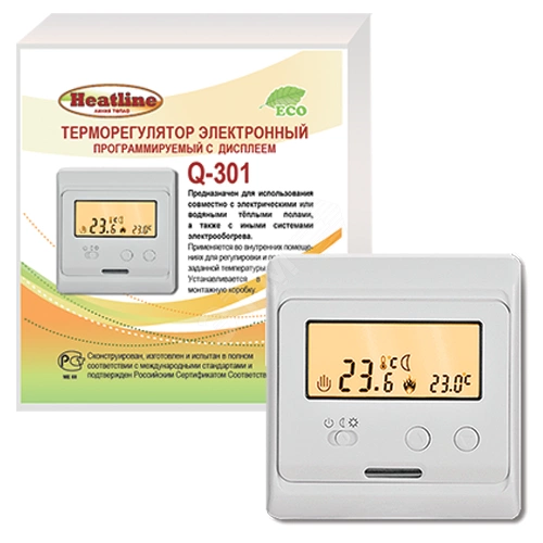 Программируемый электронный терморегулятор с жидкокристаллическим дисплеем. Может использоваться для регулирования температуры как электрических систем обогрева пола, так и водяных теплых полов. Возможно применение с электрическими теплыми полами Heatline или другими электрическими системами электрообогрева помещений. Терморегулятора Q-301 имеет два режима работы - комфортный и экономичный.
