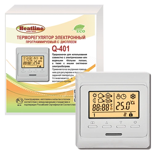 Терморегулятор Q-401 - программируемый электронный терморегулятор с жидкокристаллическим дисплеем. Может использоваться для регулирования температуры, как электрических систем обогрева пола, так и водяных теплых полов. Терморегулятор может использоваться с электрическими теплыми полами Heatline или другими электрическими системами электрообогрева помещений.