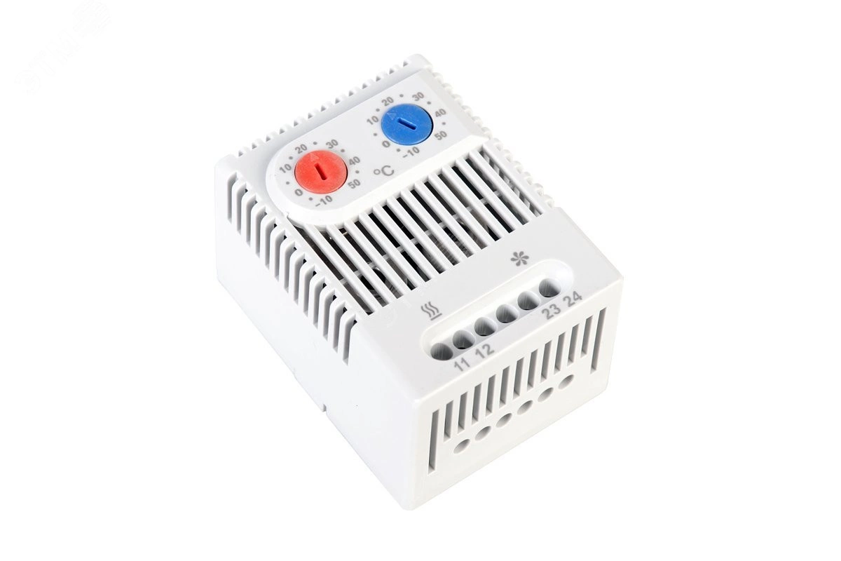 Предназначен для независимого включения и выключения нагревателей и вентиляторов в диапазоне температур от -10 до +50 градусов. Разность температур переключения 7 K, погрешность 4 К. Термостат NC регулирует нагреватели. Термостат NO регулирует вентиляторы с фильтром и сигнальные датчики при превышении температуры. Приборы нагрева и охлаждения могут быть включены независимо друг от друга.