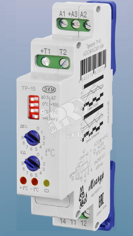 Температурное реле предназначено для контроля и поддержания заданного температурного режима по сигналам датчика температуры в помещениях, овощехранилищах, системах водяного отопле- ния, охлаждающих систем, жидкостей, предметов и т. п., а также для использования в качестве комплектующего изделия в устройствах автоматики. Конструкция Реле выпускаются в унифицированном пластмассовом корпусе с передним присоединением проводов питания и коммутируемых электрических цепей. Крепление осуществляется на монтажную шину DIN или на ровную поверхность. Для установки реле на ровную поверхность, фиксаторы замков необходимо переставить в крайние отверстия, расположенные на тыльной стороне корпуса. Конструкция клемм обеспечивает надежный зажим проводов сечением до 2,5 мм2.