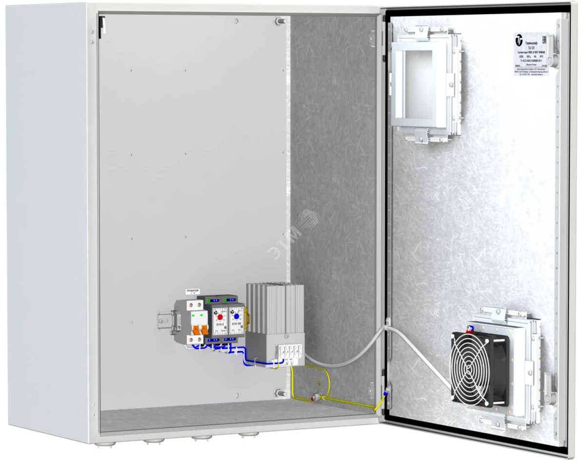 Термошкаф ТШ-12В предназначен для установки в нём телевизионного либо другого электронного оборудования и поддержания заданного температурного режима при эксплуатации этого оборудования. Термошкаф оборудован: блоком управления климатом (БУК-5), предназначенным для управления системой обогрева, блоком управления климатом (БУК-5В), предназначенным для управления системой вентиляции, обогревателем термошкафов ОТШ-160, оборудованным встроенным биметаллическим выключателем, ограничивающим температуру поверхности радиатора до +90 С, вентиляторной системой охлаждения, тамперным контактом для сигнализации о несанкционированном доступе.