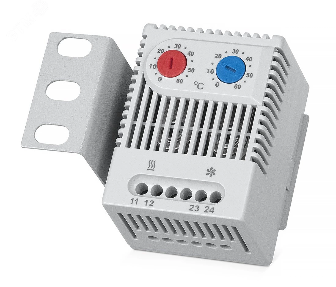 Два термостата в одном корпусе. Отдельные линии для охлаждения и для нагревания. Температура задается пользователем с помощью поворотных регуляторов на корпусе термостата. Термостат подключается в разрыв сети питания вентиляторного блока и нагревательного элемента. При достижении заданной температуры замыкается цепь и подается напряжение на вентиляторы или нагревательный элемент. Термостат поставляется вместе с креплением для установки на направляющие 19'.