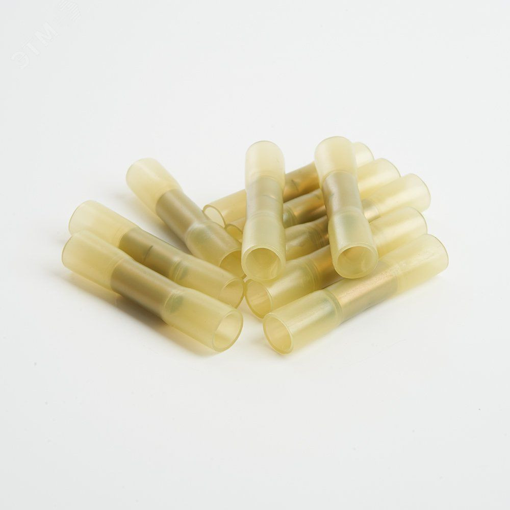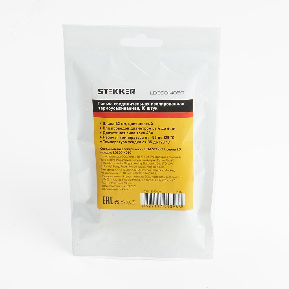 Термоусадочные коннекторы STEKKER LD300-4060, длина 42мм., 10шт. в наборе, цвет - желтый. Коэффициент усадки 2 -1, диапазон рабочих температур -10..+35 градусов Цельсия, температура усадки +85..+125 градусов Цельсия, номинальный ток 48А, для проводов сечением до 6 мм2. Стопорная высечка посередине соединительной гильзы ограничивает глубину ввода провода. Изолирующая термоусаживаемая трубка имеет 3 цветовых кода - в зависимости от диаметра/сечения гильзы. Гильза надевается на один из проводов, концы проводов соединяются, так чтобы их проволоки вошли друг в друга. На середину соединения надвигается гильза и обжимается специальным инструментом, далее нагревается при помощи промышленного фена. Происходит усадка термоусаживаемой оболочки, которая герметизирует полученное соединение.